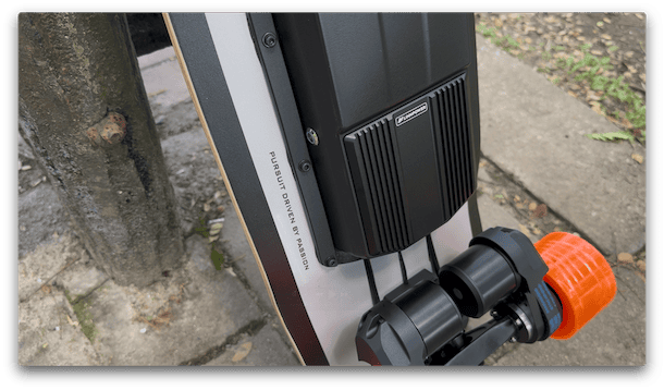 This all connects to Lorentz’s custom 16S ESC, which is incredibly smooth. Acceleration feels natural, braking feels predictable, and the board responds exactly how you expect it to. The ESC is mounted on top of the deck near the rear, which frees up space underneath and makes cooling and maintenance easier.