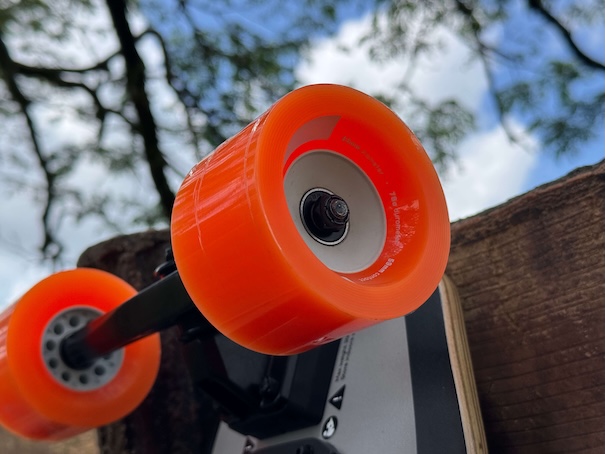 The board comes with 19-inch (48.3 cm) precision channel trucks, crafted from CNC-machined 6061 aluminum. Out of the box, they’re paired with Riptide bushings. We’ll talk about ride feel shortly, but structurally, these trucks inspire confidence. They’re built for stability and safety at high speeds.