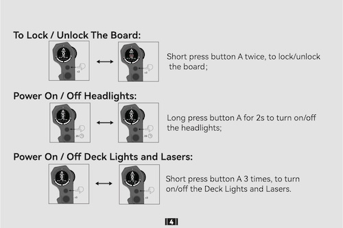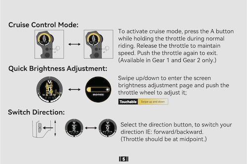 - Features: Cruise control, board lock, lighting control