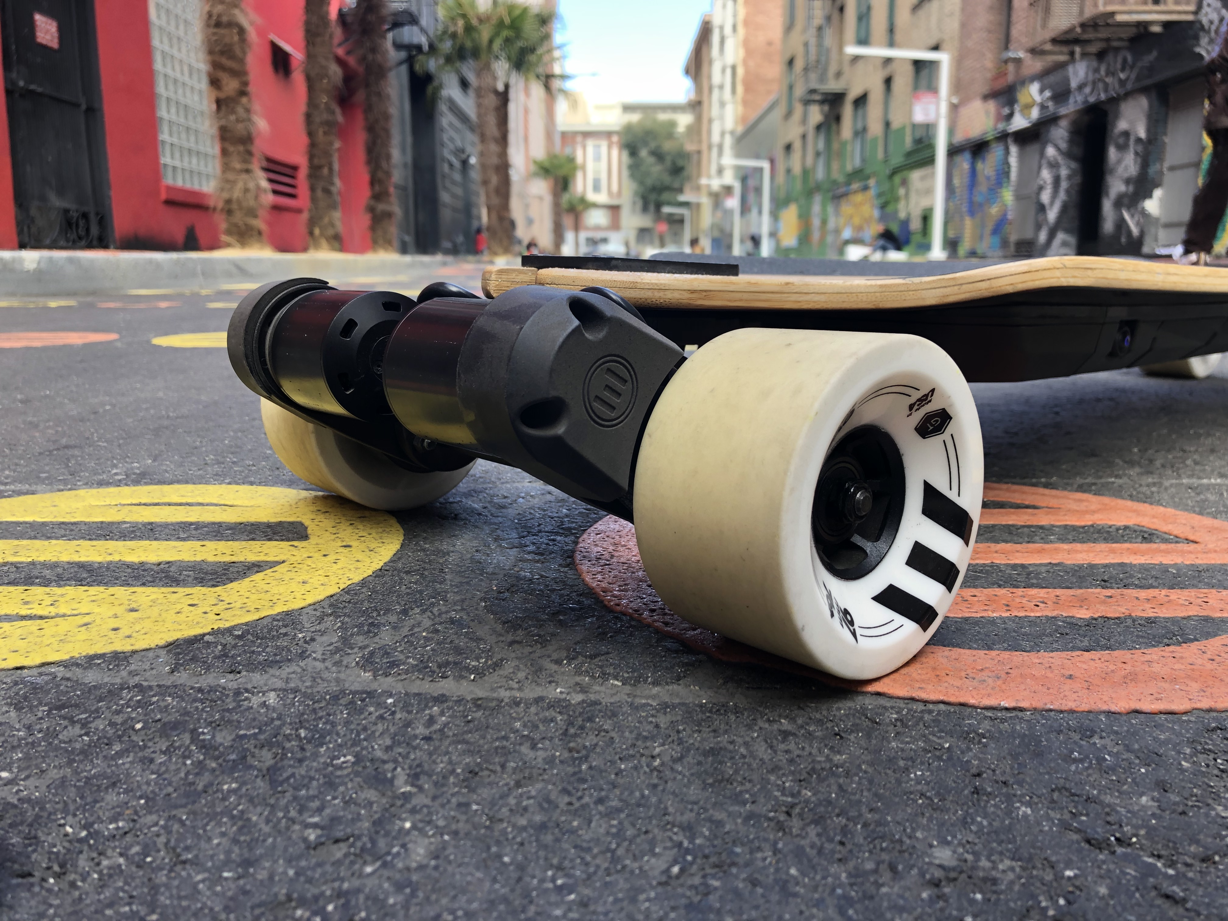 New wheels. Let’s talk about the wheels for a second. First off, they’re really great. I mean really. I’ve tried all the ABEC wheels, all Evolve’s old wheels, and a whole bunch of other wheels. The rebound on the urethane is great, and it really grips the road and takes potholes well. I run Boas on my main DIY board, and honestly I like these 97s ever so slightly better. It’s high praise, I know, and the durability and long term coloration of these wheels are still to be determined, but so far so very good.