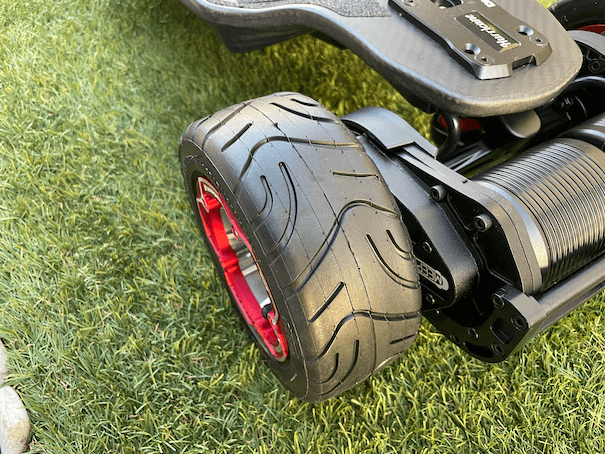 So, let’s talk about the gear drive. These are a pair of 3500W, 6374 motors. Meepo refers to this as the Gear Drive System 4.0, a name that doesn’t mean much to us other than the fact that it is not the planetary gear drive used on the previous City Rider 2 and Ecomobl boards. Gear drives are always exciting because while keeping the smooth ride that results from not having a hard hub core inside the wheels, they offer better battery efficiency than belt-drive. These gear drives are generally more expensive; for example, Meepo allows customization of the Hurricane via the Hurricane Ultra product page, and the gear drive option is priced $100 higher than the belt version. While these drives must still be time-tested for durability, so far, we haven’t heard much about failures related to the gear drive.